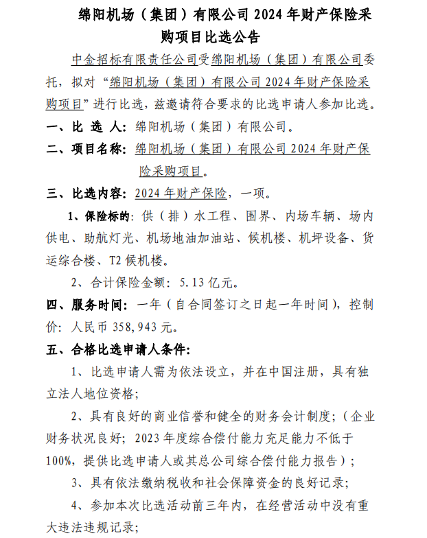 綿陽機(jī)場(集團(tuán))有限公司2024年財(cái)產(chǎn)保險(xiǎn)采購項(xiàng)目比選公告