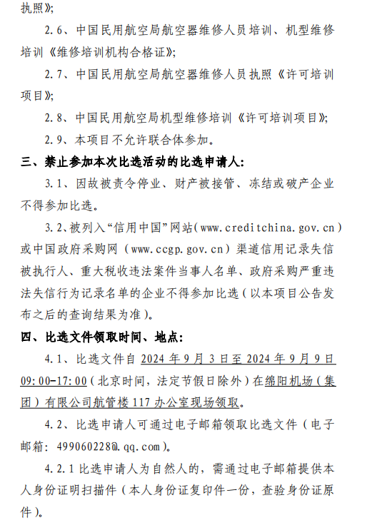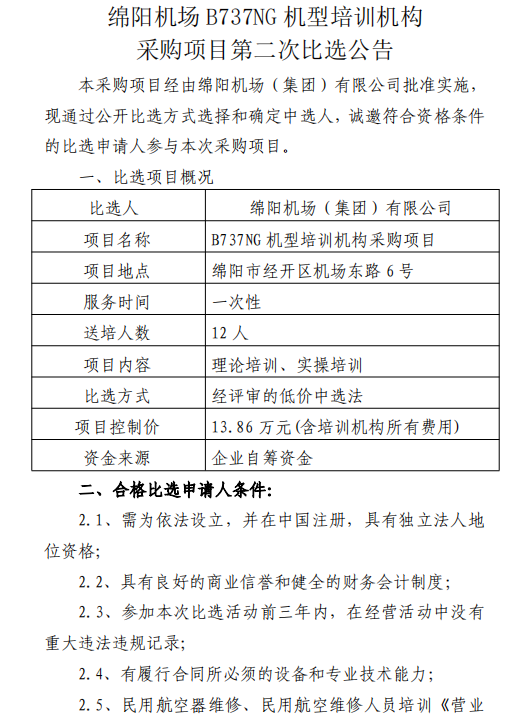 綿陽機場B737NG機型培訓機構采購項目第二次比選公告